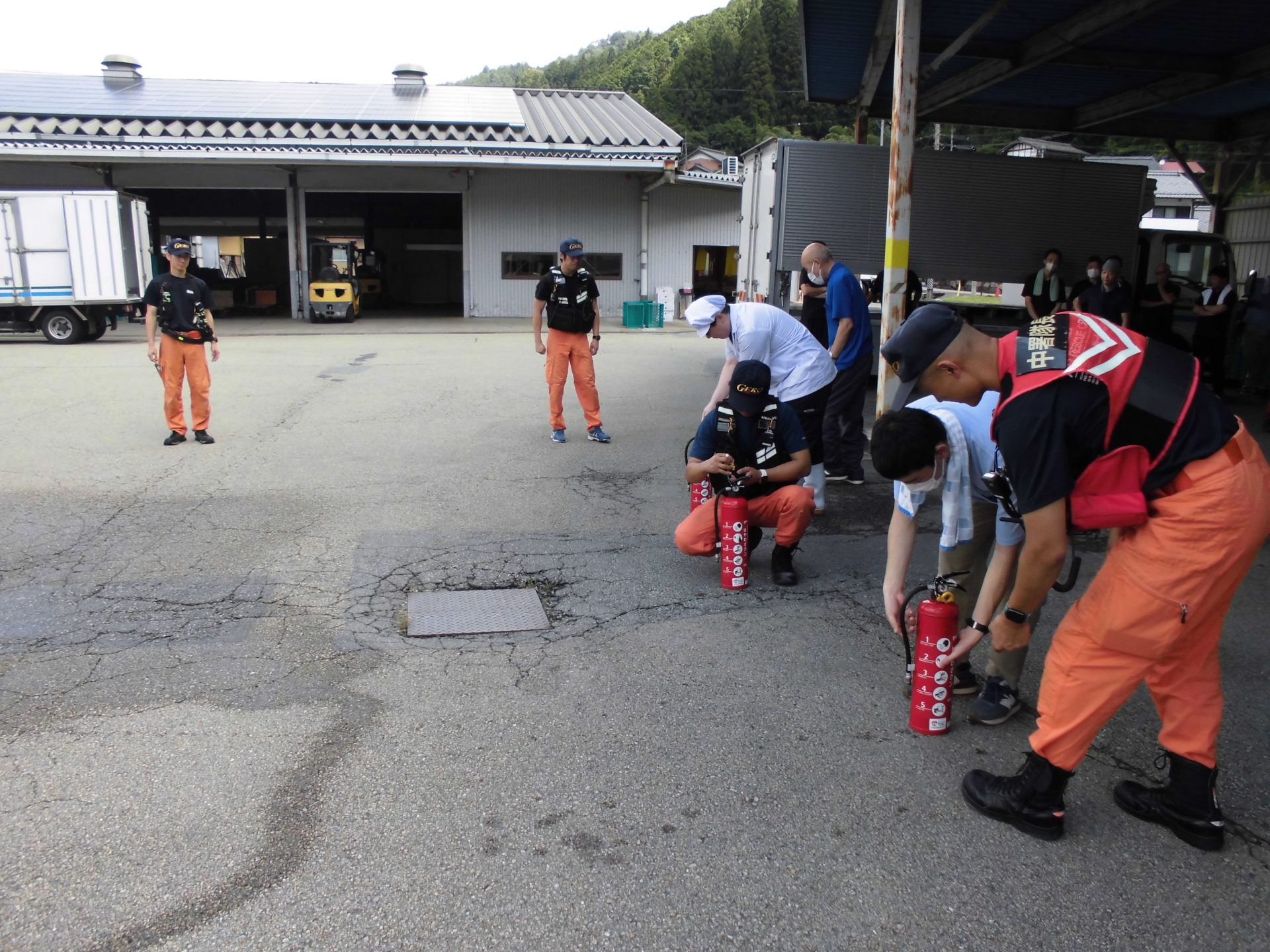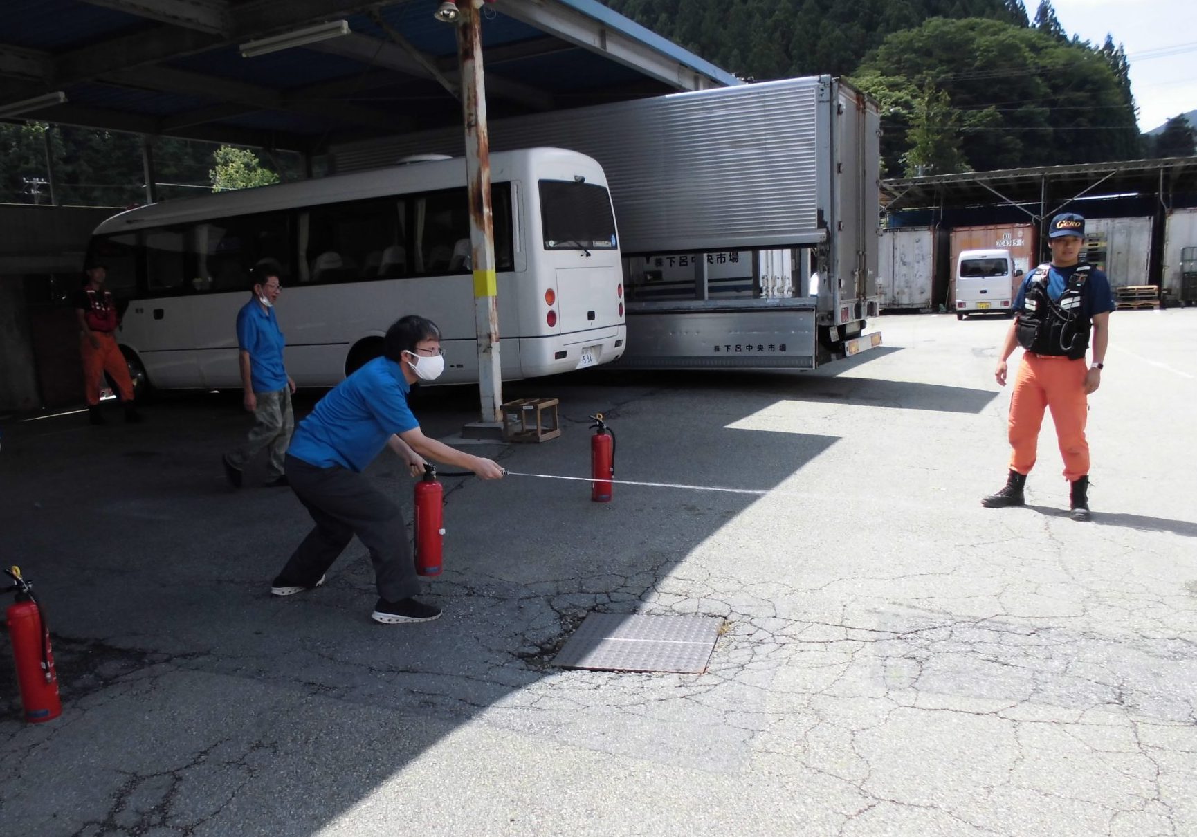 消火器を使って火消し練習